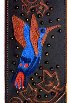 Handcut layers of kidskin created ivy and leaves and multicolored hummingbirds.